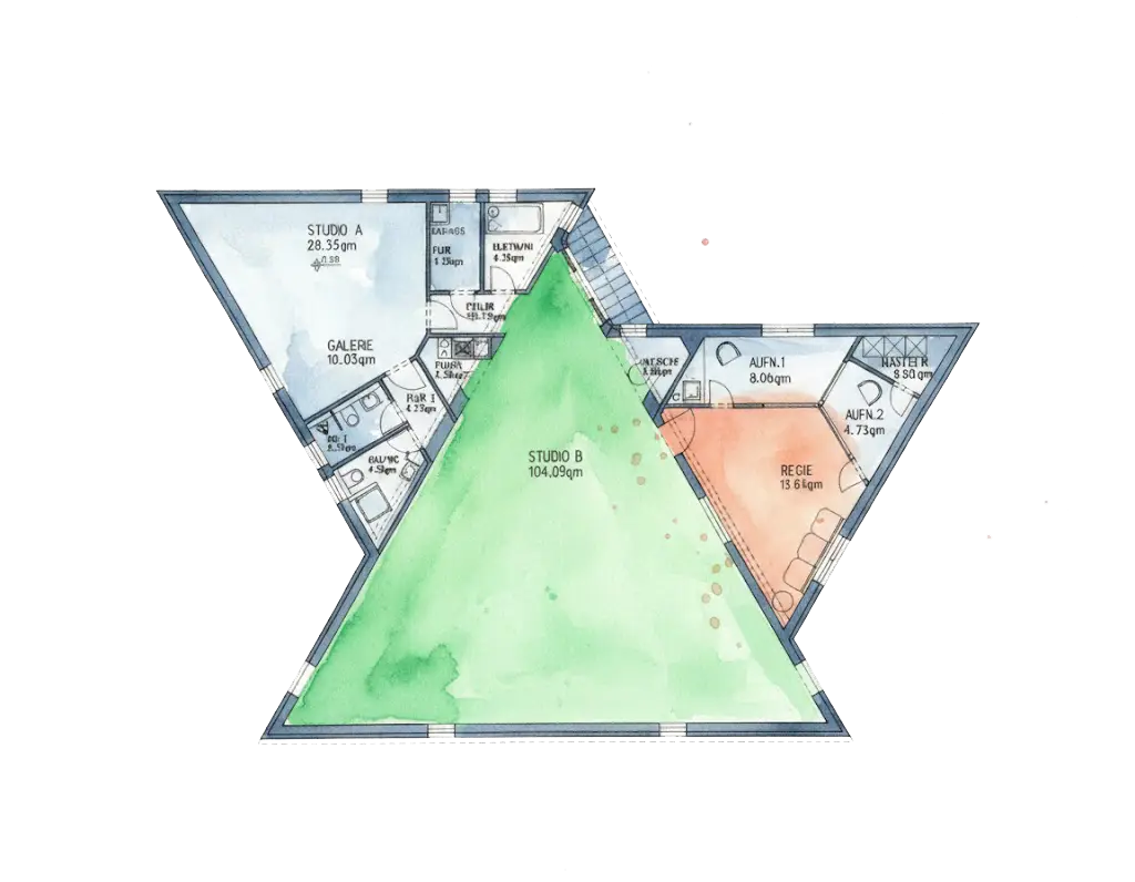 Eine Optimale Akustik – für alle Aufnahmesituationen ? – die gibt es nicht! Aber es gibt sehr wohl akustische Probleme, die man in keiner Situation haben will. Wir haben uns dem Problem „Stehende Wellen“ und „Flatterechos“ angenommen und durch ein dreieckiges Raumdesign aller Studioräume zumindest mal das Thema Flatterechos eliminiert. Die stehenden Wellen sind auch in einem dreieckigen Raum nicht zu ignorieren. Da sie aber schwer zu berechnen sind, haben wir messtechnisch frequenzspezifische Überhöhungen identifiziert und durch klassische Absorber geglättet.